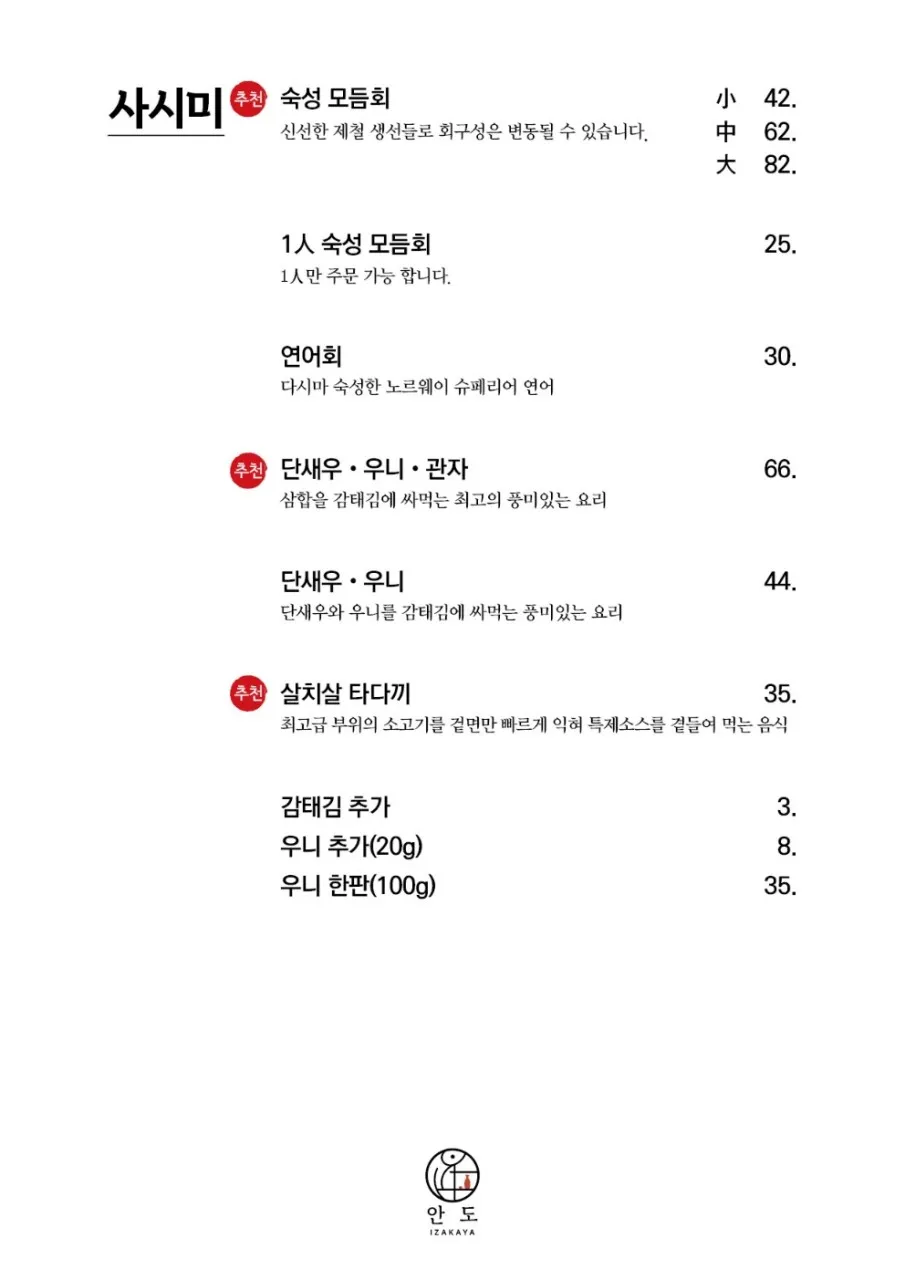 숙성회와 사케를 통해 색다른 미식을 즐기고자 한다면 안도는 최적의 선택입니다.