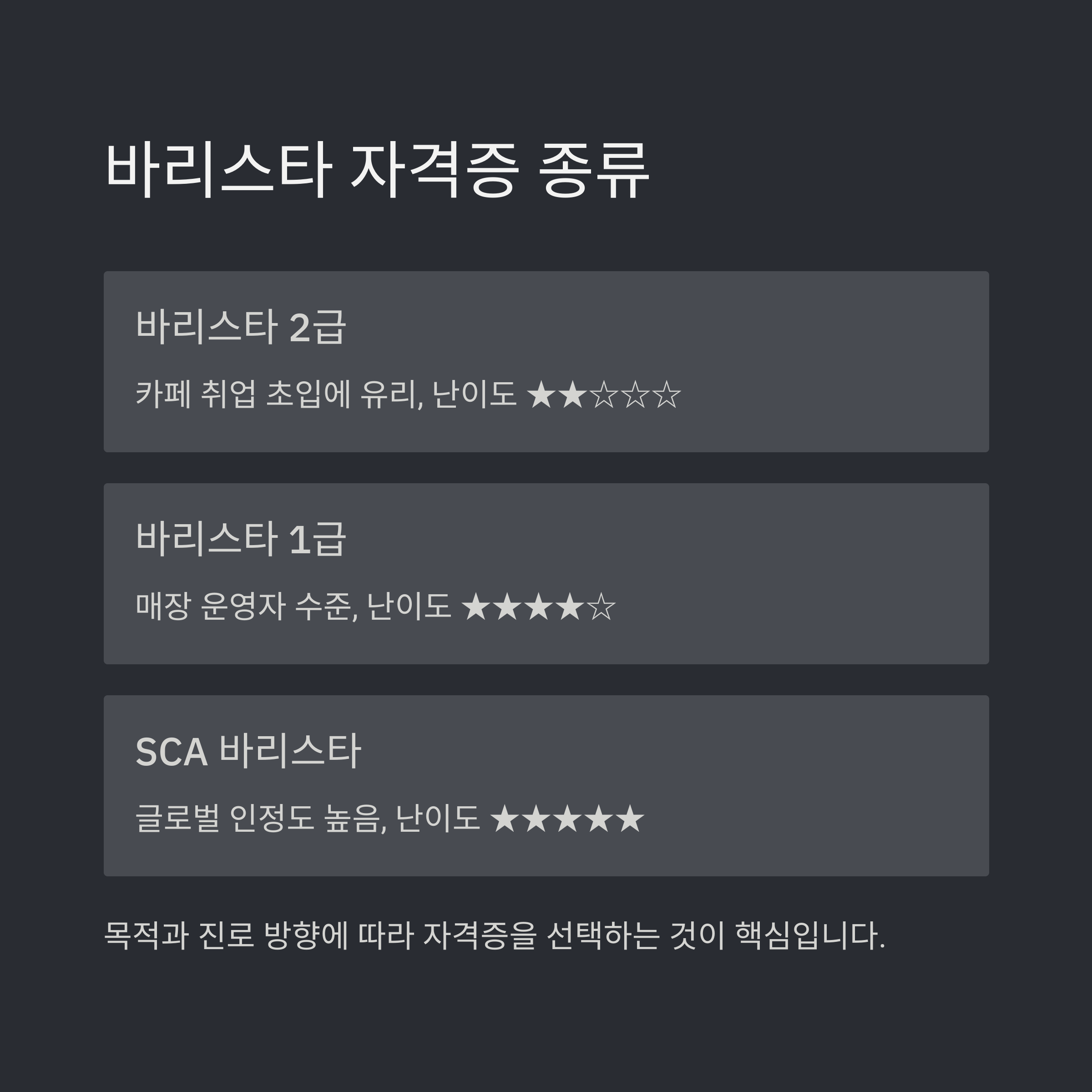 | 바리스타 1급 (민간) | 매장 운영자 수준 | ★★★★☆ |