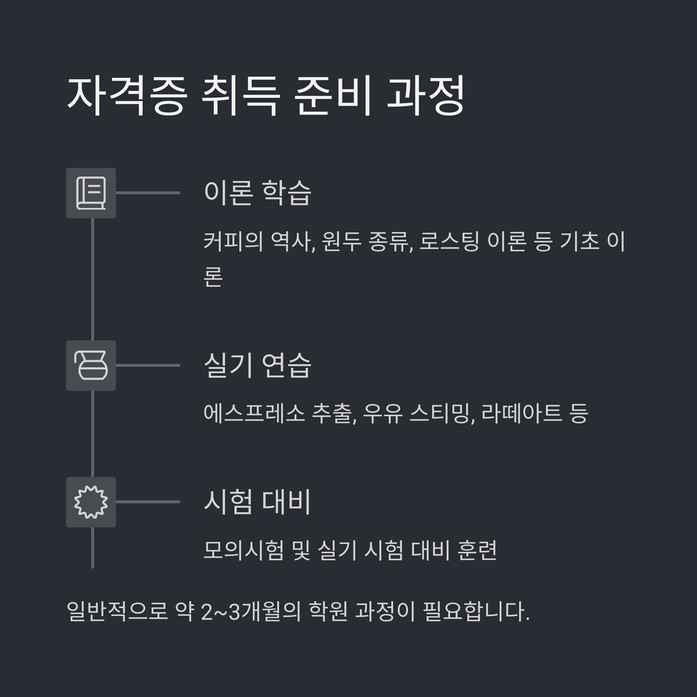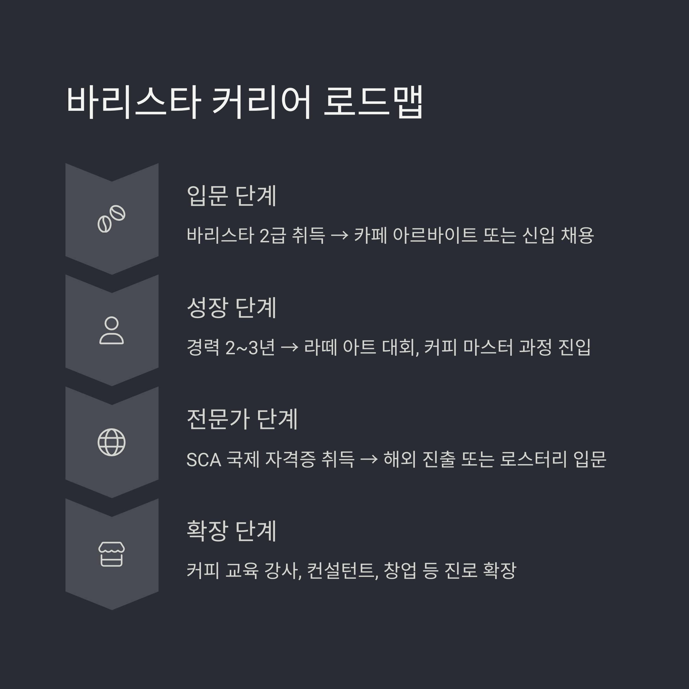 - Step 1: 바리스타 2급 취득 → 카페 아르바이트 또는 신입 채용