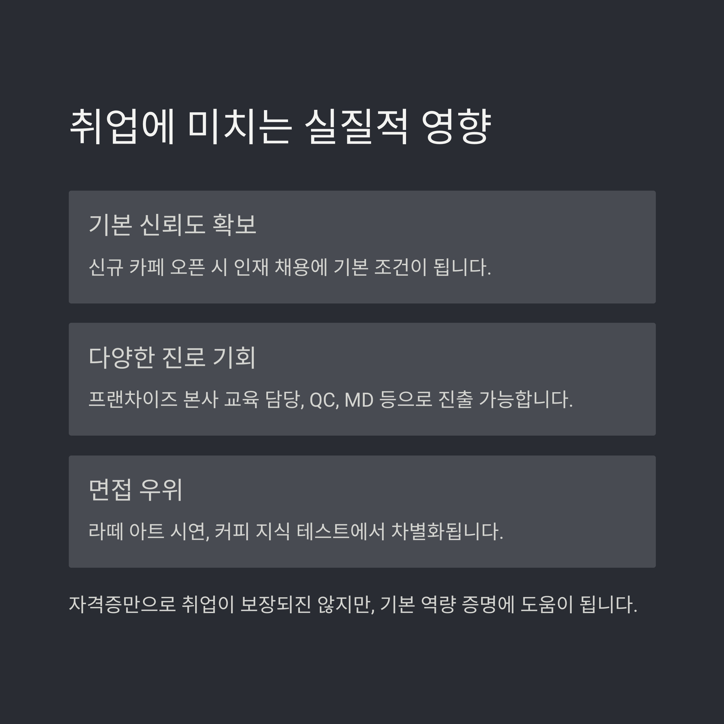 - 커피 교육 강사, 커피 컨설턴트 등의 부가 진로로 확장 가능