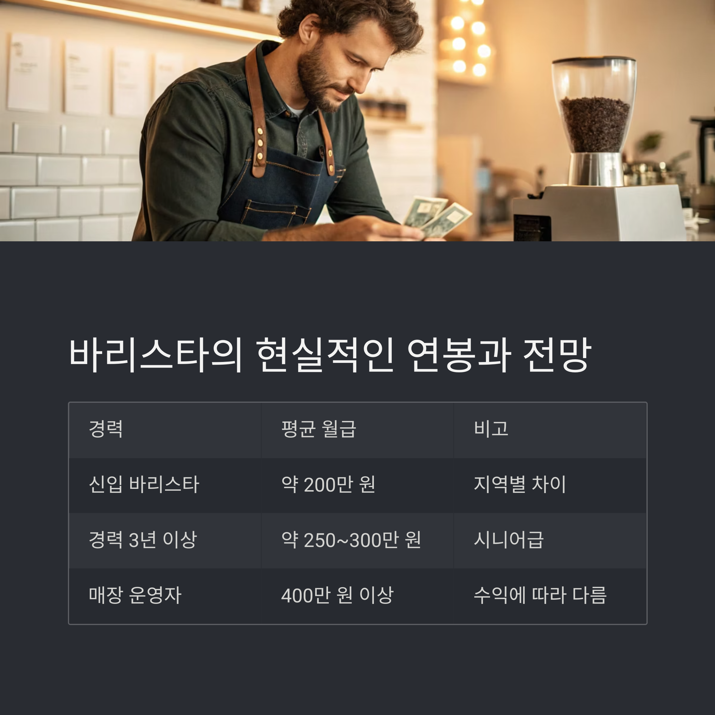 | 경력 3년 이상 | 약 250~300만 원 | 시니어 바리스타급 |