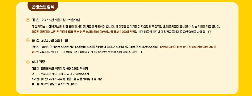 세계 각국의 라면을 직접 선택해 끓여 먹고, 다양한 참여형 이벤트가 준비되어 있어 남녀노소 누구나 즐길 수 있는 체험형 축제입니다.