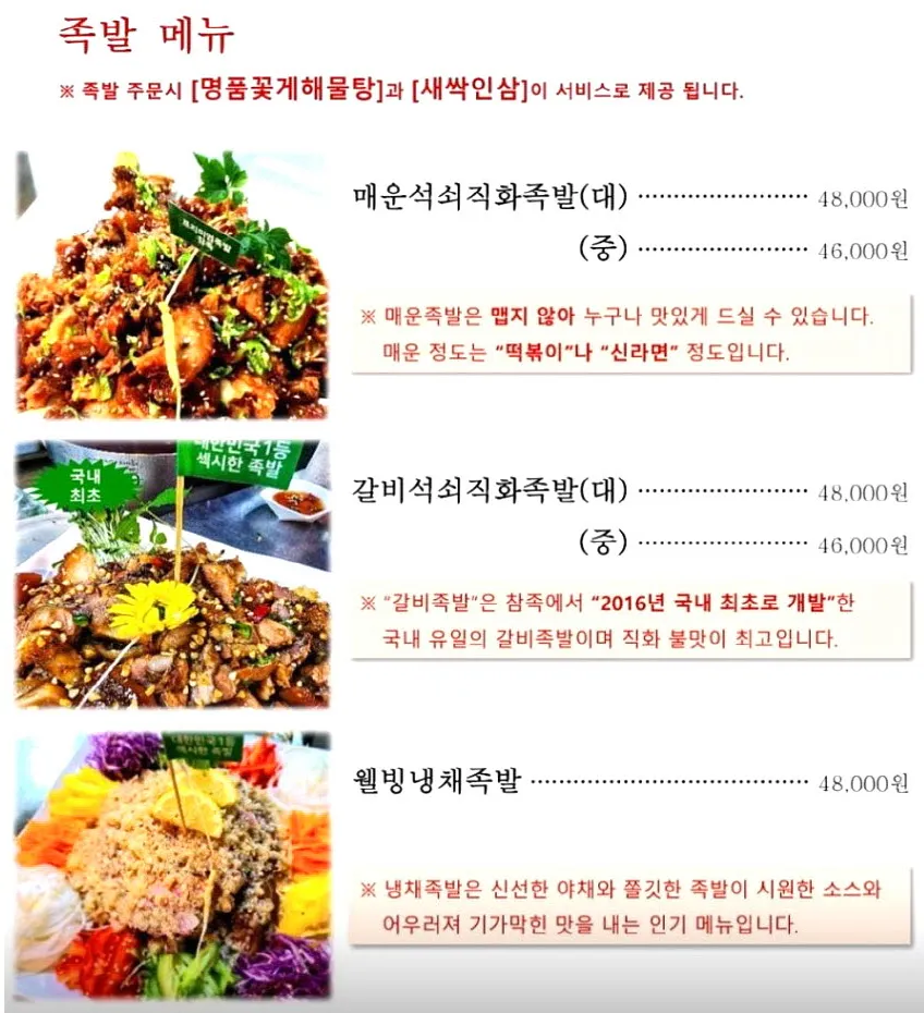 | 매운석쇠직화족발 | 48,000원 | 매콤한 양념으로 색다른 맛 제공 |