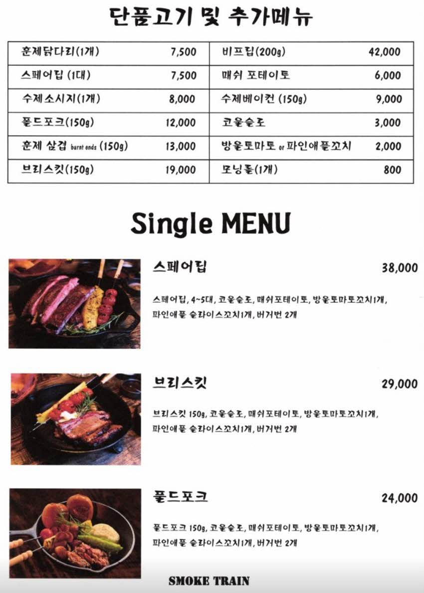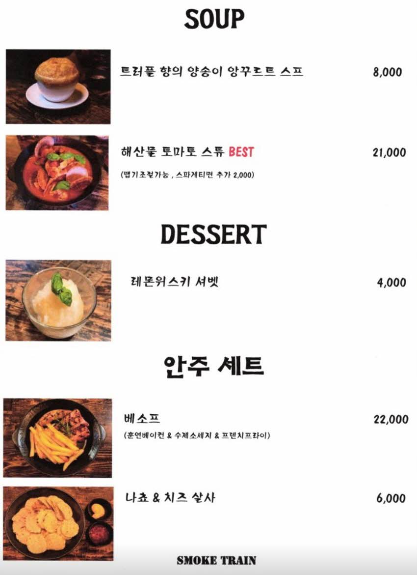 - "오랜만에 만난 친구들과 함께한 스모크 트레인! 웰컴 드링크로 제공된 따뜻한 뱅쇼로 시작해, 포크 플래터의 부드러운 고기와 수제 소시지의 풍미에 감탄했습니다. 예약하고 방문하길 잘했어요."