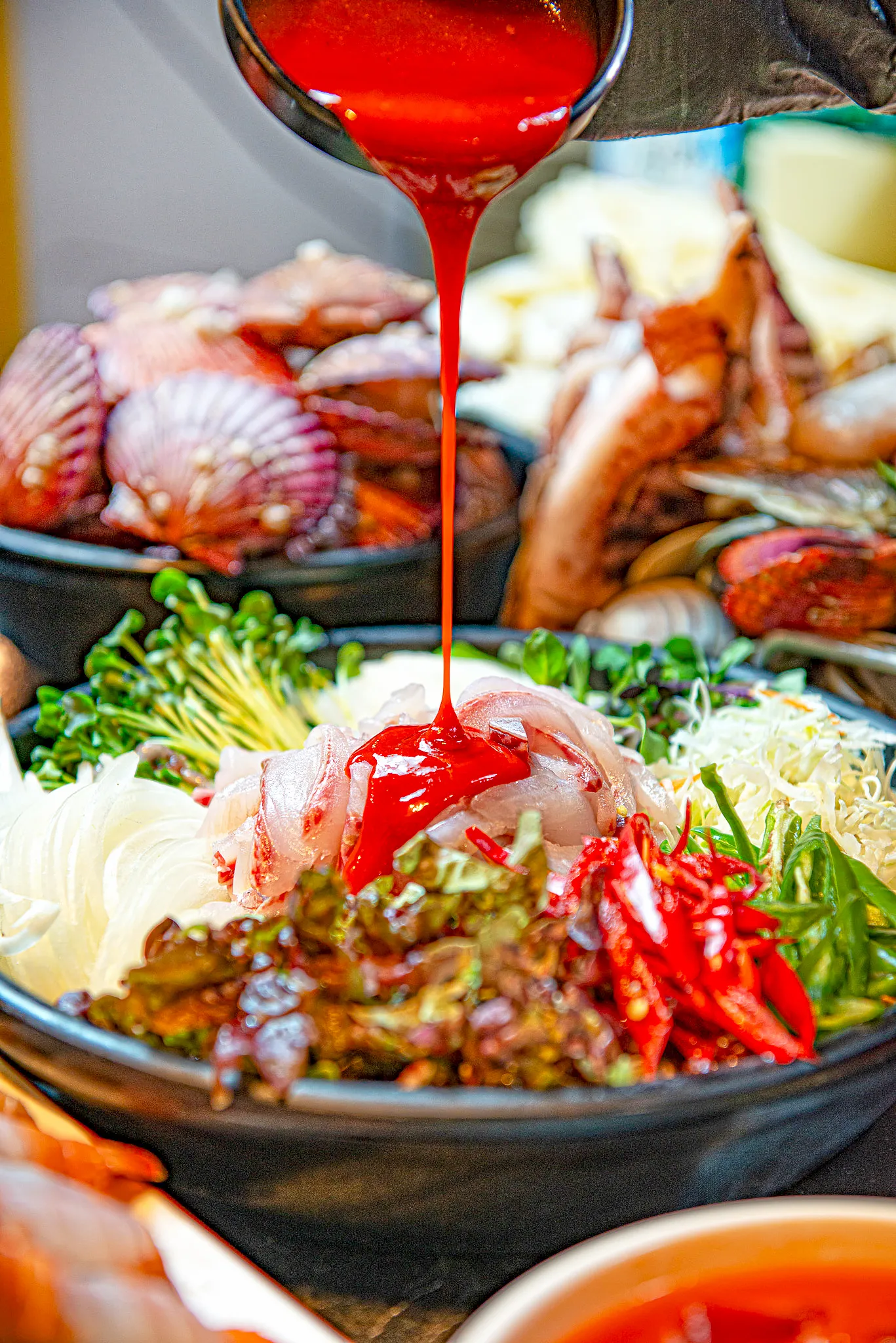 각종 조개와 해산물이 어우러진 인기 메뉴 - 통큰 물회: 48,000원