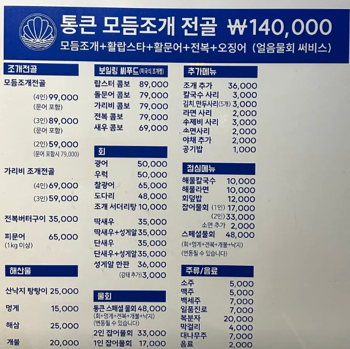 푸짐한 조개찜과 싱싱한 해산물 요리를 원하신다면 '통큰조개회'를 강력 추천드립니다.