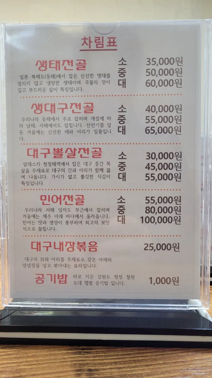 신선한 생대구를 사용한 전골로, 맑은 국물의 지리 스타일입니다. 국물은 시원하고 깔끔하며, 대구살은 부드럽고 촉촉합니다.