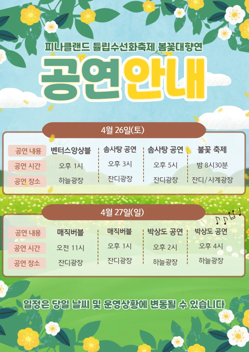 튤립축제는 매년 4월 초부터 5월 초까지 진행됩니다. 꽃의 개화 시기에 따라 약간의 변동이 있을 수 있으니, 방문 전에 공식 홈페이지나 SNS를 통해 꼭 확인해 주세요.
