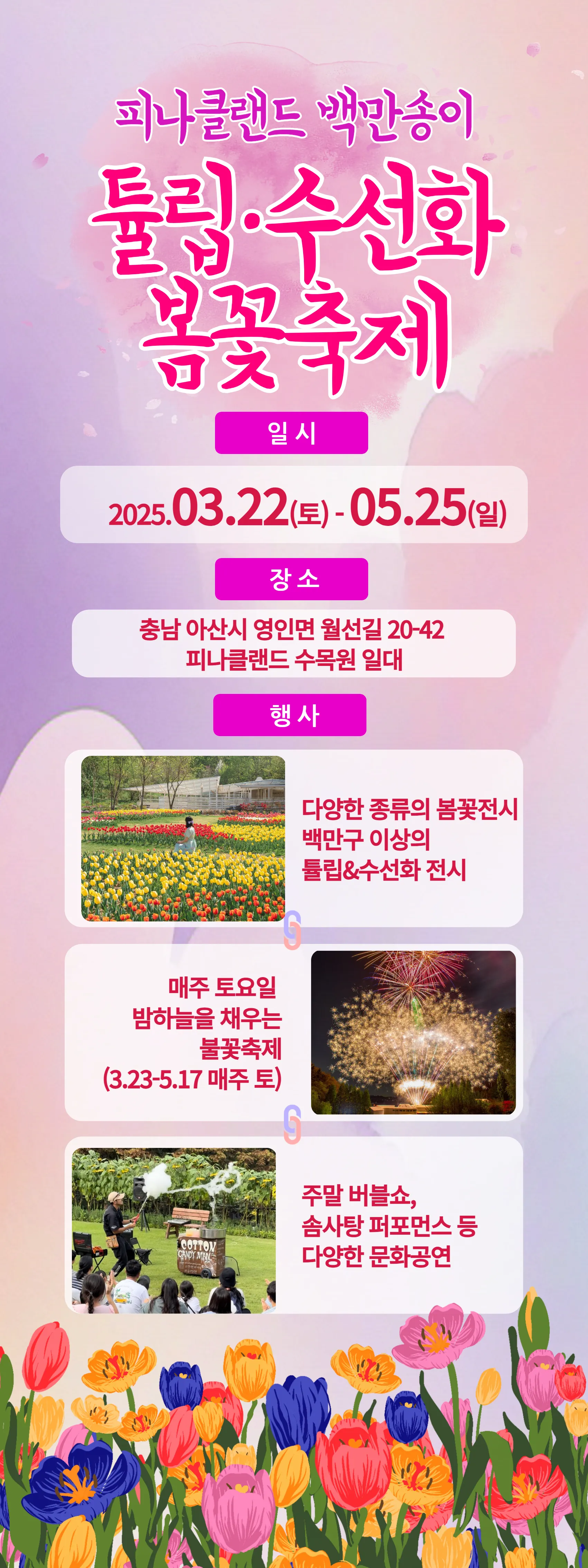 충남 아산 피나클랜드 튤립축제와 불꽃놀이는 봄을 대표하는 낭만적인 이벤트입니다. 누군가와 함께 아름다운 꽃과 불빛이 어우러진 이 특별한 경험을 만든다면, 잊을 수 없는 소중한 하루가 될 것입니다.