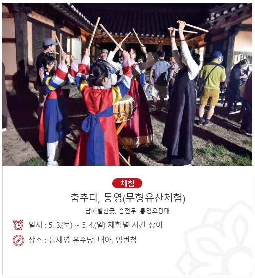 예능 체험으로는 전통 춤과 음악을 배워보는 ‘춤추다, 통영’이 마련돼 있어, 몸으로 문화유산을 느껴보는 기회도 주어집니다.