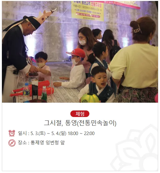 매일 오후 6시부터 밤 10시까지 삼도수군통제영과 통제영 거리 일원에서 다채로운 체험과 공연이 펼쳐지며, 누구나 무료로 참여할 수 있습니다.