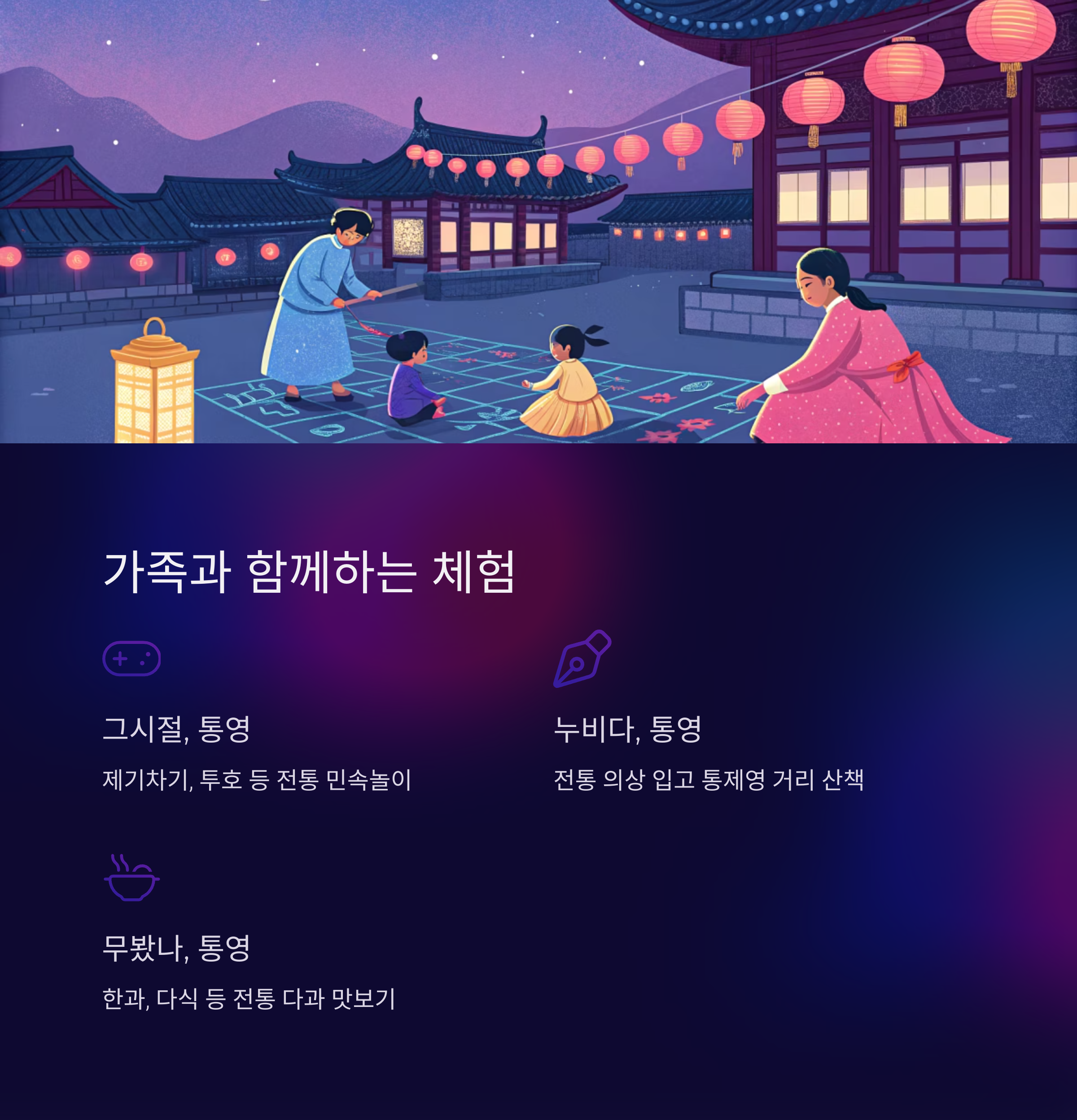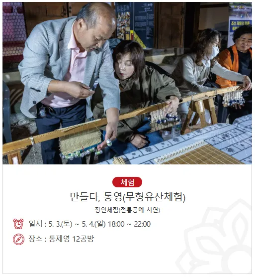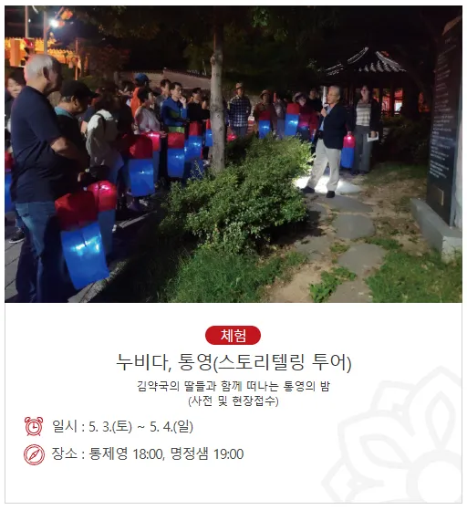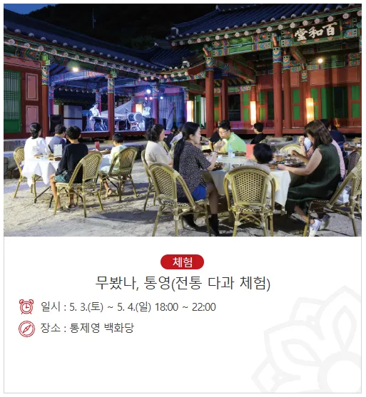 ‘누비다, 통영’에서는 전통 의상을 입고 통제영 거리를 걸으며 조선시대 인물이 된 듯한 이색 경험도 가능하며, ‘무봤나, 통영’에서는 한과와 다식 등 통영의 전통 다과를 맛보며 밤의 여유를 즐길 수 있습니다.