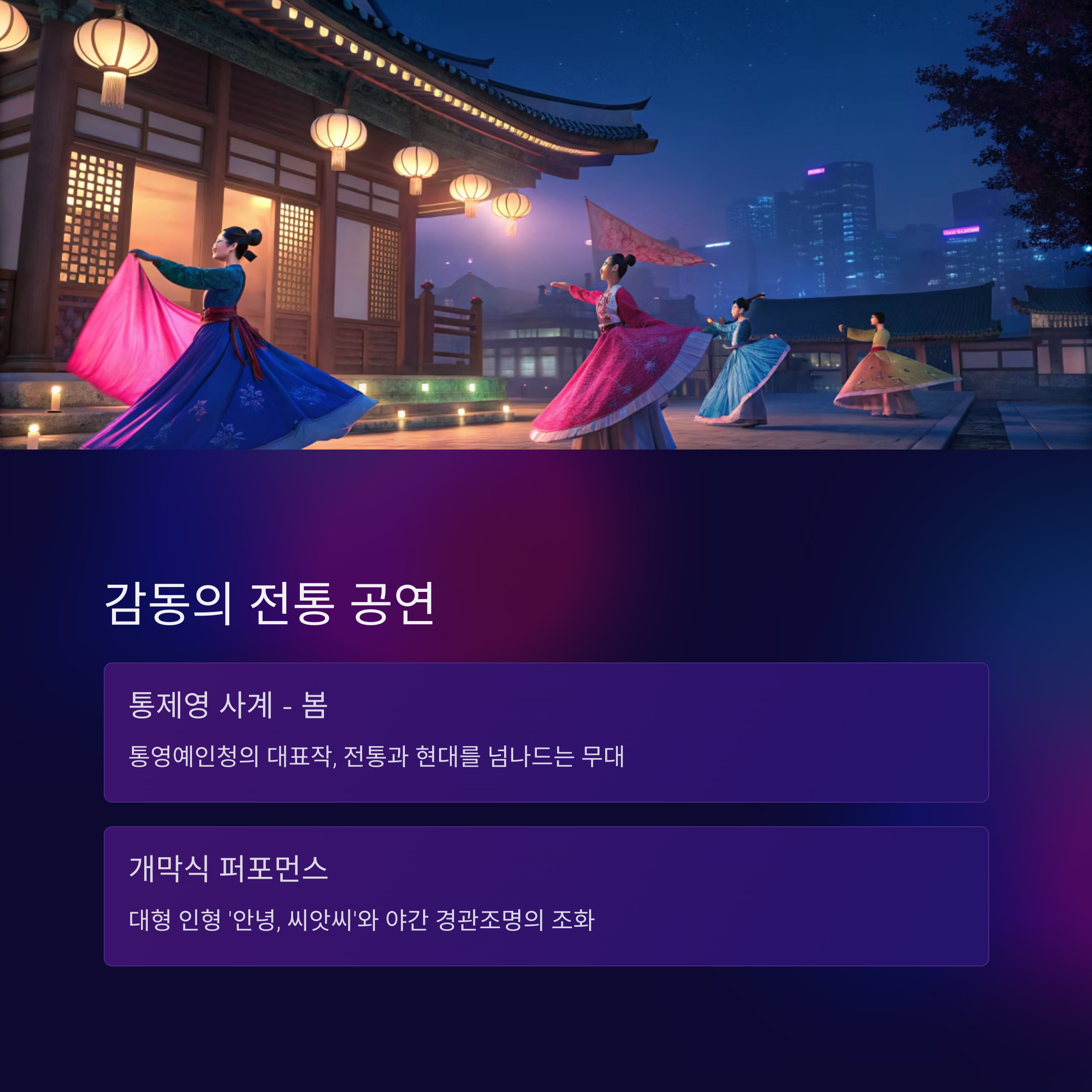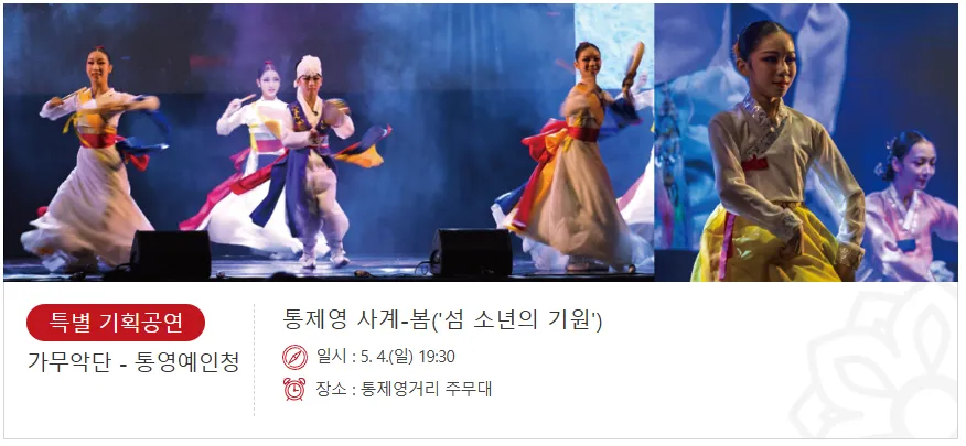 ‘통제영 사계 – 봄(섬 소년의 기원)’은 통영예인청의 대표작으로, 전통과 현대를 넘나드는 무대가 인상적입니다.