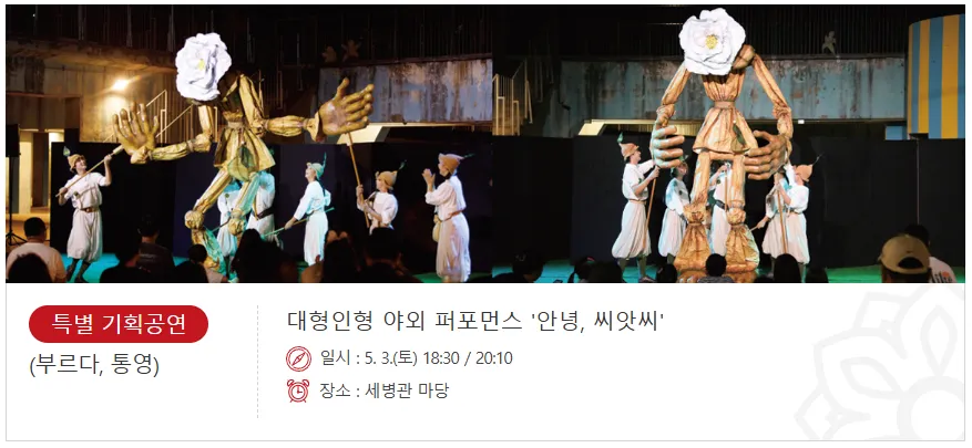 개막식에는 대형 인형 퍼포먼스 ‘안녕, 씨앗씨’와 야간 경관조명이 어우러져, 분위기 있는 통영의 밤을 연출합니다.