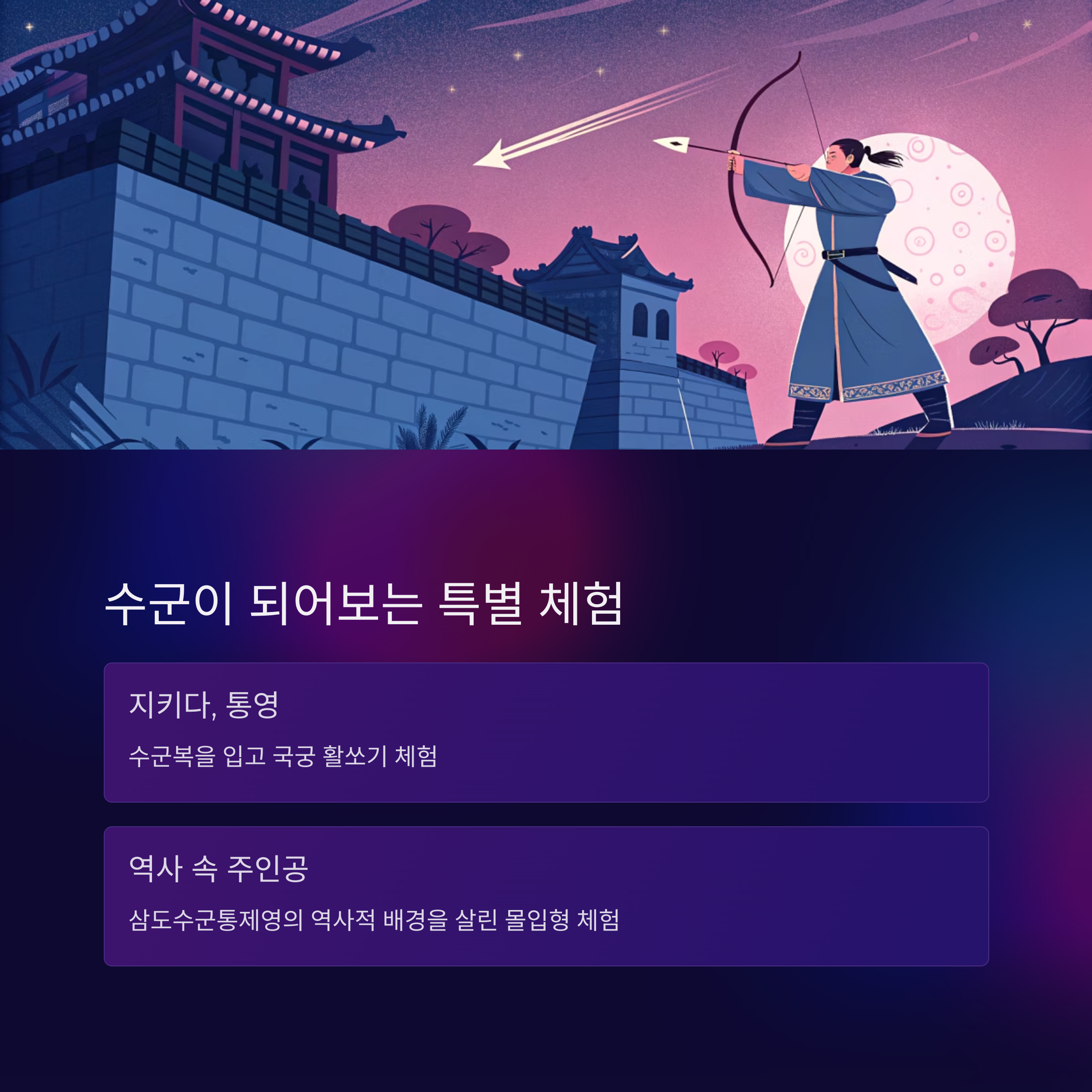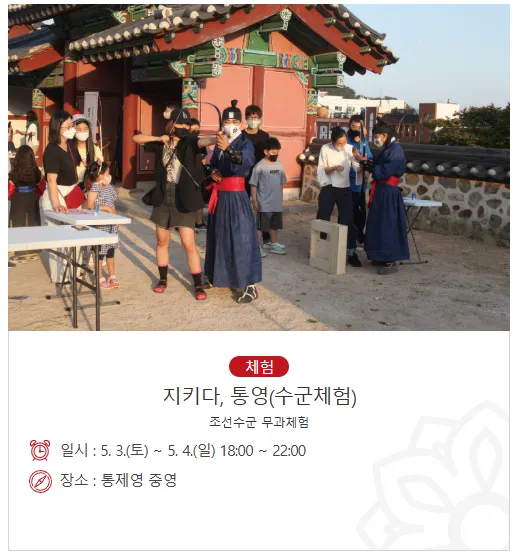 삼도수군통제영의 역사적 배경을 살린 프로그램으로, 단순한 체험을 넘어 역사 속 주인공이 된 듯한 몰입감을 제공합니다.