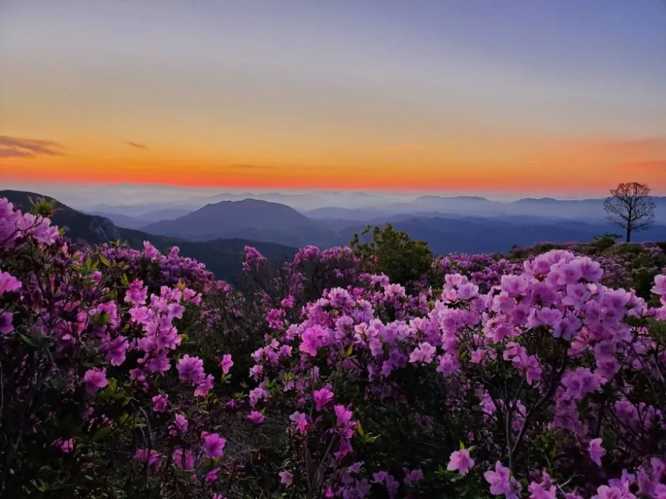 해발 800m의 광활한 평원에 펼쳐진 철쭉은 시야 방해 없는 촬영이 가능하며, 일출과 철쭉이 함께 담기는 황금 시간대도 존재합니다.