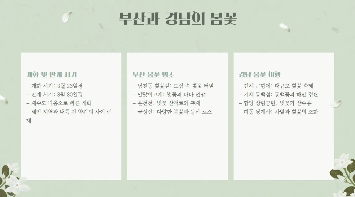 | 제주도의 아름다운 벚꽃 여행 | 부산에서 벚꽃과 함께 바다 풍경 | 서울의 봄꽃과 문화 행사 |