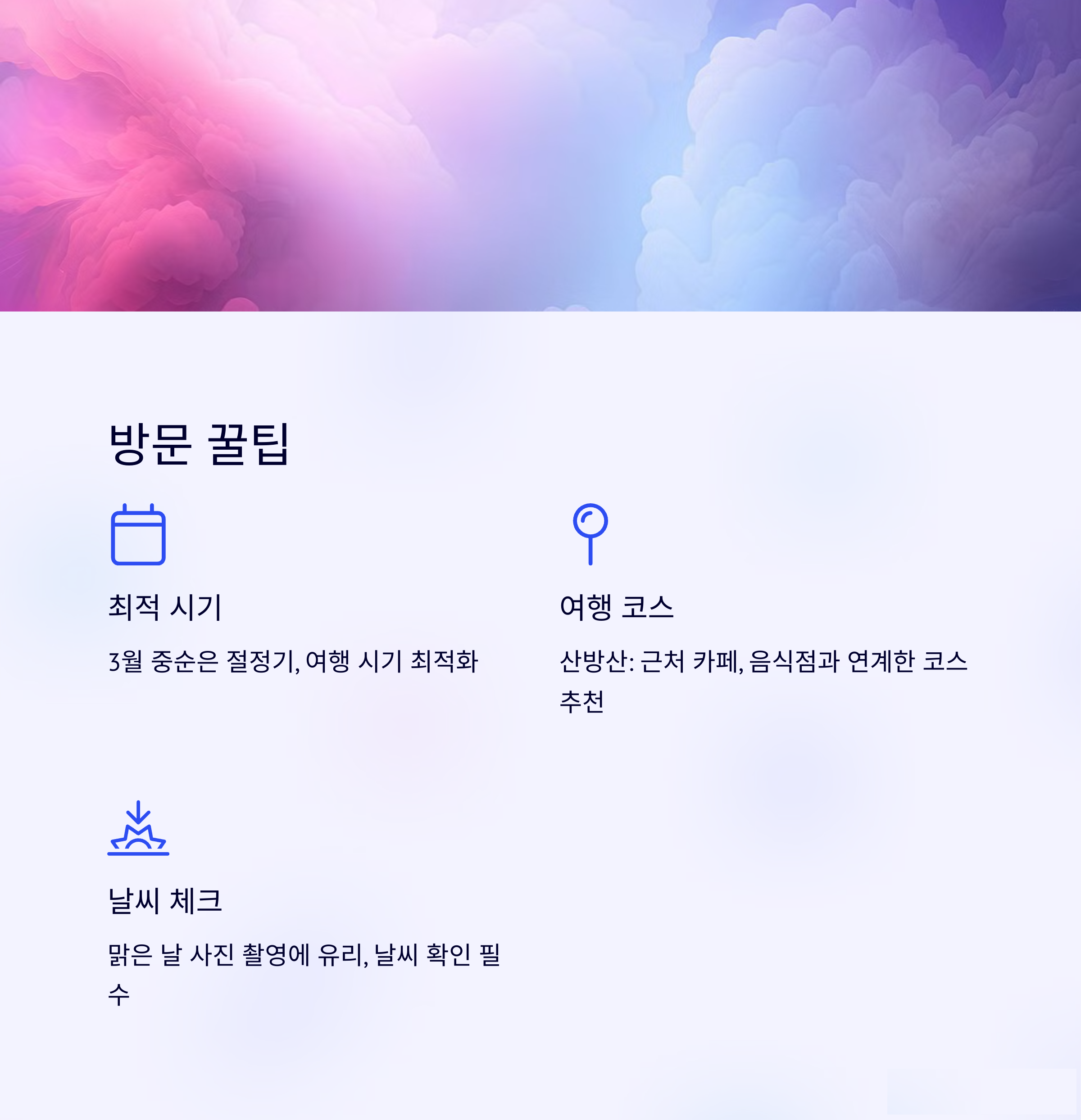 | 추천 명소 1 | 산방산 유채꽃밭 (입장료: 1,000원) |