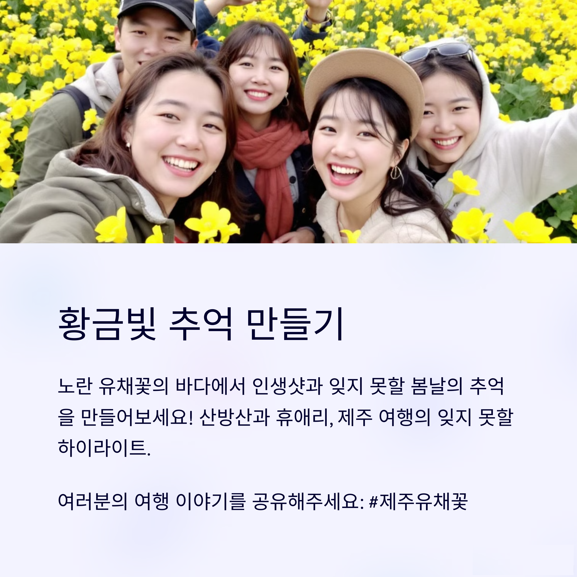 안녕하세요, 봄을 사랑하는 여러분! 제주도의 3월은 따뜻한 바람과 함께 노란 유채꽃이 활짝 피어나는 계절입니다. 이 시기에 제주를 찾는다면, 산방산 유채꽃밭과 휴애리 자연생활공원에서 환상적인 풍경을 만나볼 수 있습니다. 유채꽃의 싱그러운 향기 속에서 걷다 보면, 자연이 선물하는 아름다움을 온전히 느낄 수 있죠. 특히 인생샷을 남기기에 더할 나위 없는 장소들이라 많은 여행자들이 찾는 곳이기도 합니다. 지금부터, 제주에서 유채꽃을 가장 아름답게 감상할 수 있는 두 곳을 소개해 드릴게요!