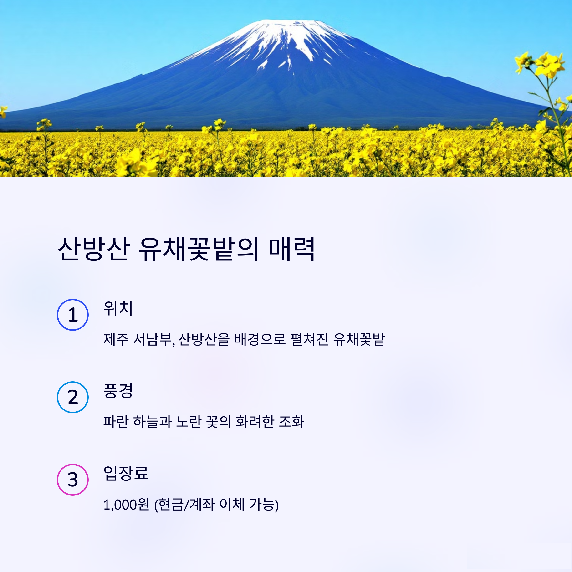 | 추천 명소 1 | 산방산 유채꽃밭 (입장료: 1,000원) |