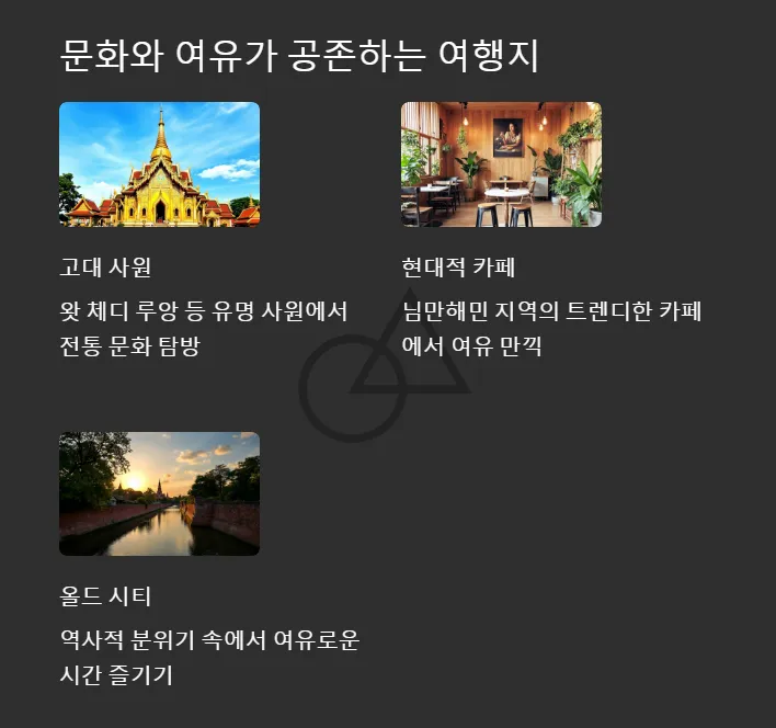 문화유산을 둘러보며 여유롭게 시간을 보내고 싶다면 치앙마이는 최고의 선택입니다.